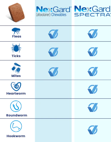 NexGard Spectra Chewable Tablets for Dogs are used for treating flea and tick infestations in dogs when concurrently preventing lungworm and heartworm disease and/or treatment of gastrointestinal worm infestations (e.g., roundworms) is required. NexGard Spectra also treats sarcoptic mange and demodicosis.