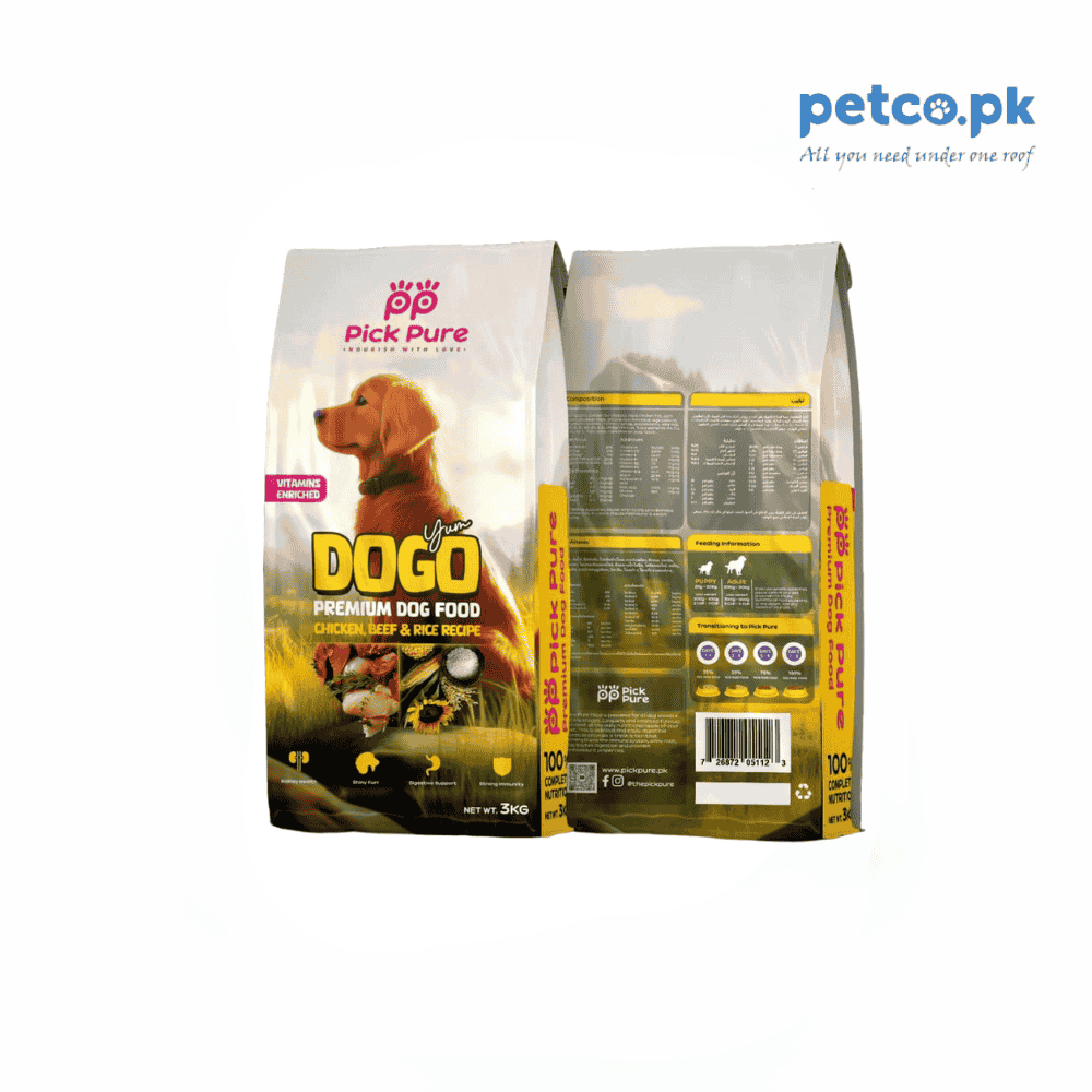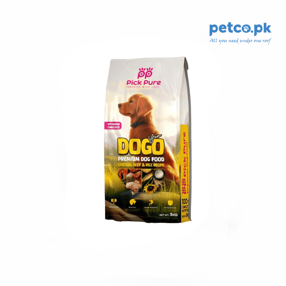 Pick Pure Dogo Premium Dog Food in Pakistan and is Suitable for All Dog Breeds & All Life Stages of Dogs from Puppy to Adult Dog. Pick Pure Dog Food Formula is Developed Under the Careful eye of an Experienced Veterinarian. This Food for Dogs Formula Meets All the Daily Requirements of Your Lovely Furry Friend Nutritional Requirements Which Your Dog Required on a Daily Basis. This Dog Food Formula is Delicious loved by your Pets and Helps to Improve the Digestive System of Dogs. The Triple Action Formula of this Premium Dog Food Strengthens the Immune System of Your Dogs, Build the Shiny Coat, and Improve Skin also provides antioxidant Properties.