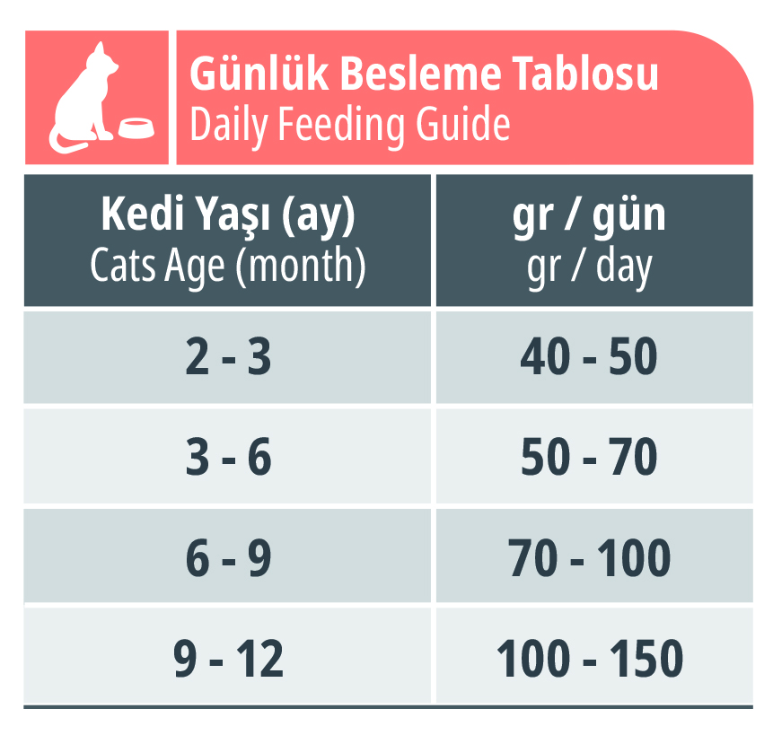 ⦁ The recommended daily amount of food may vary depending on the outdoor temperature, your cat’s living conditions (indoor/outdoor), character and activity.